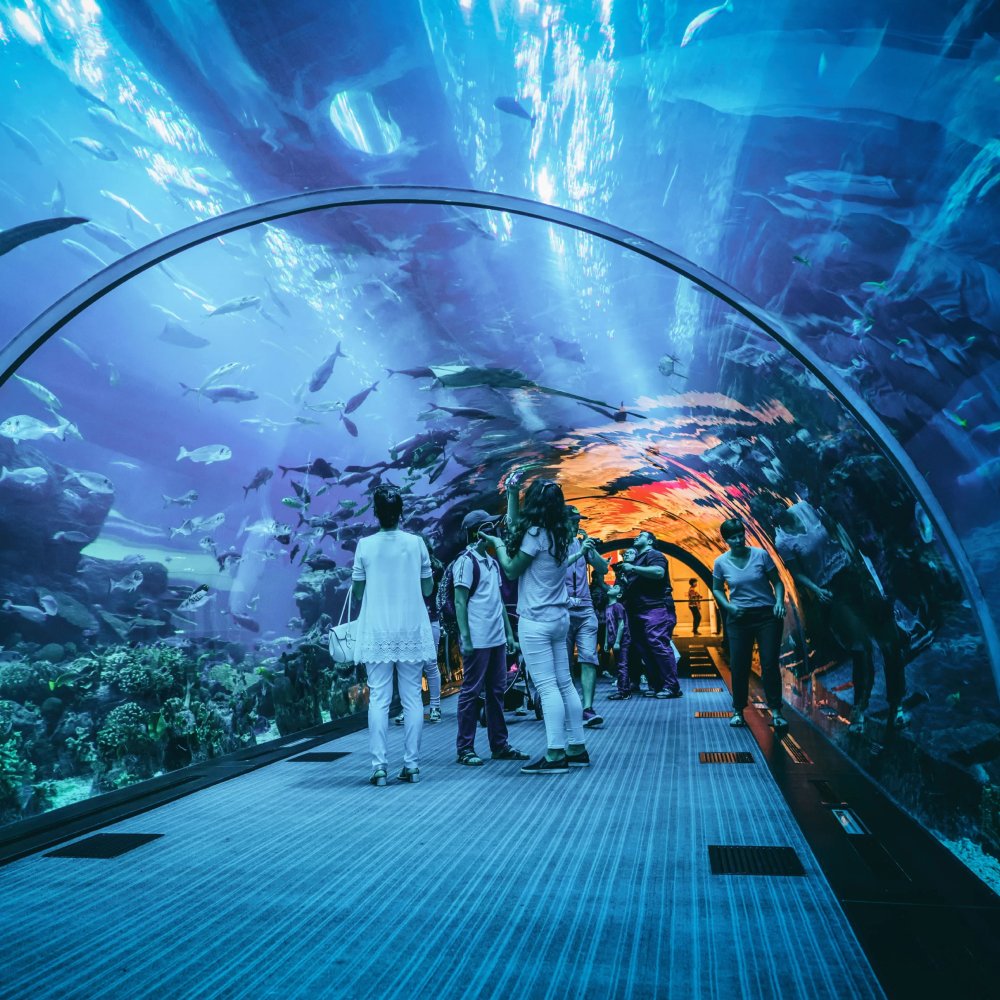Following a captivating multimedia presentation on the emirate’s past and a rapid elevator ride, get ready to be enveloped by the unrivaled 360 degree views of Dubai as you stand on Burj Khalifa’s 124th level observation deck. Look out over the city’s glamorous skyline, compelling desert beauty, and gleaming ocean all from a sensational perspective, before you make your way down to the aquarium.